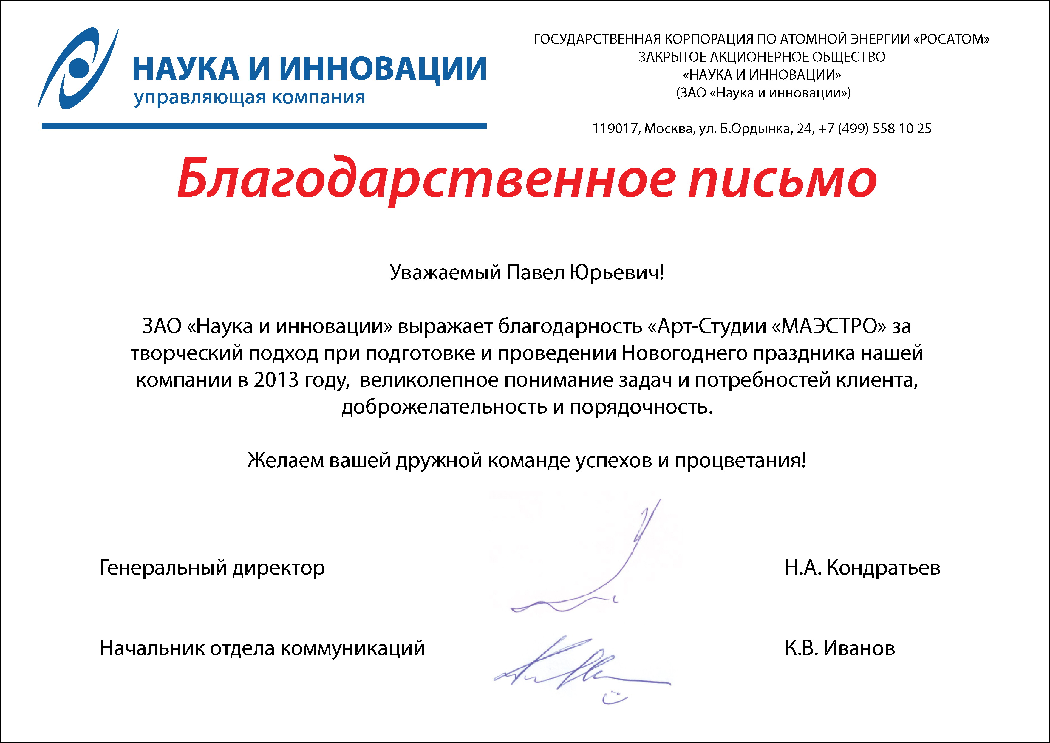 ЗАО "Наука и инновации" выражает благодарность Арт-студии "Маэстро" за творческий подход в подготовке и проведении Новогоднего праздника нашей компании в 2013 году, великолепное понимание задач и потребностей клиента, доброжелательность и порядочность.