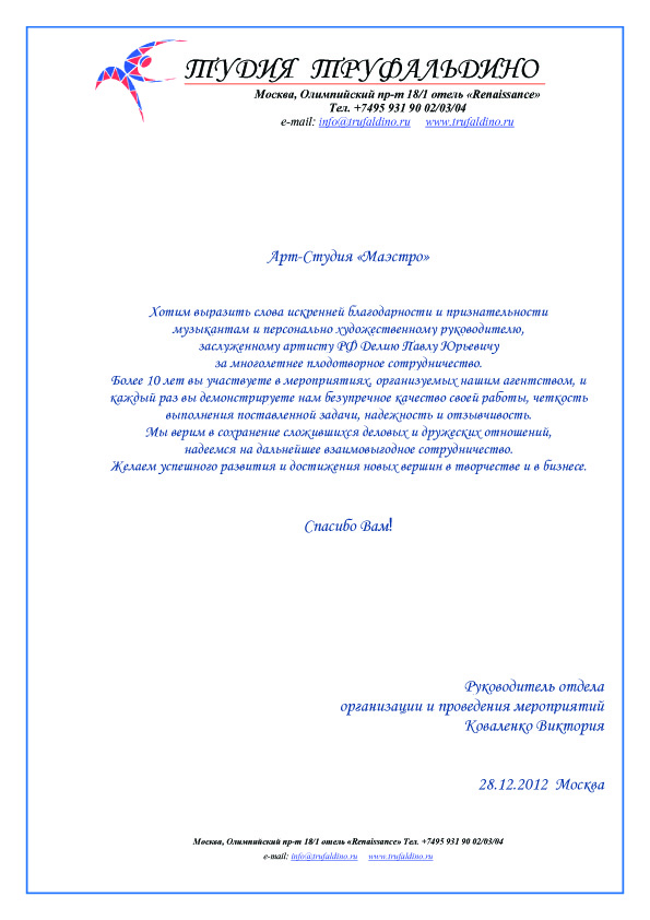 Ценим Ваш коллектив за ответственность, пунктуальность, профессионализм и доброжелательность. Джазовые композиции в исполнении музыкального квартета Арт-студии «Маэстро» второй год подряд создают прекрасное настроение для гостей нашего форума! Не сомневаемся в продолжении наших деловых отношений и желаем Вашему коллективу новых творческих достижений и ошеломительного успеха!