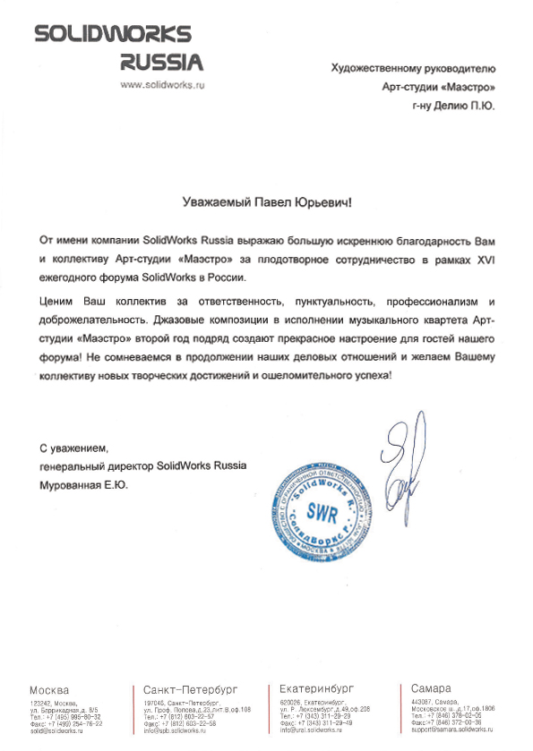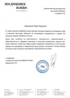 От имени компании Solidworks Russia выражаю большую искреннюю благодарность Вам и коллективу Арт-студии «Маэстро» за плодотворное сотрудничество в рамках XVI ежегодного форума Solidworks в России.