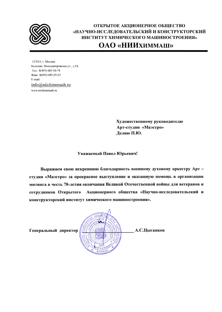 Выражаем свою искреннюю благодарность военному духовому оркестру Арт-студии "Маэстро" за прекрасное выступление и оказанную помощь в организации митинга в честь 70-летия окончания Великой Отечественной войны для ветеранов и сотрудников Открытого акционерного общества "Научно-исследовательский и конструкторский институт химического машиностроения"