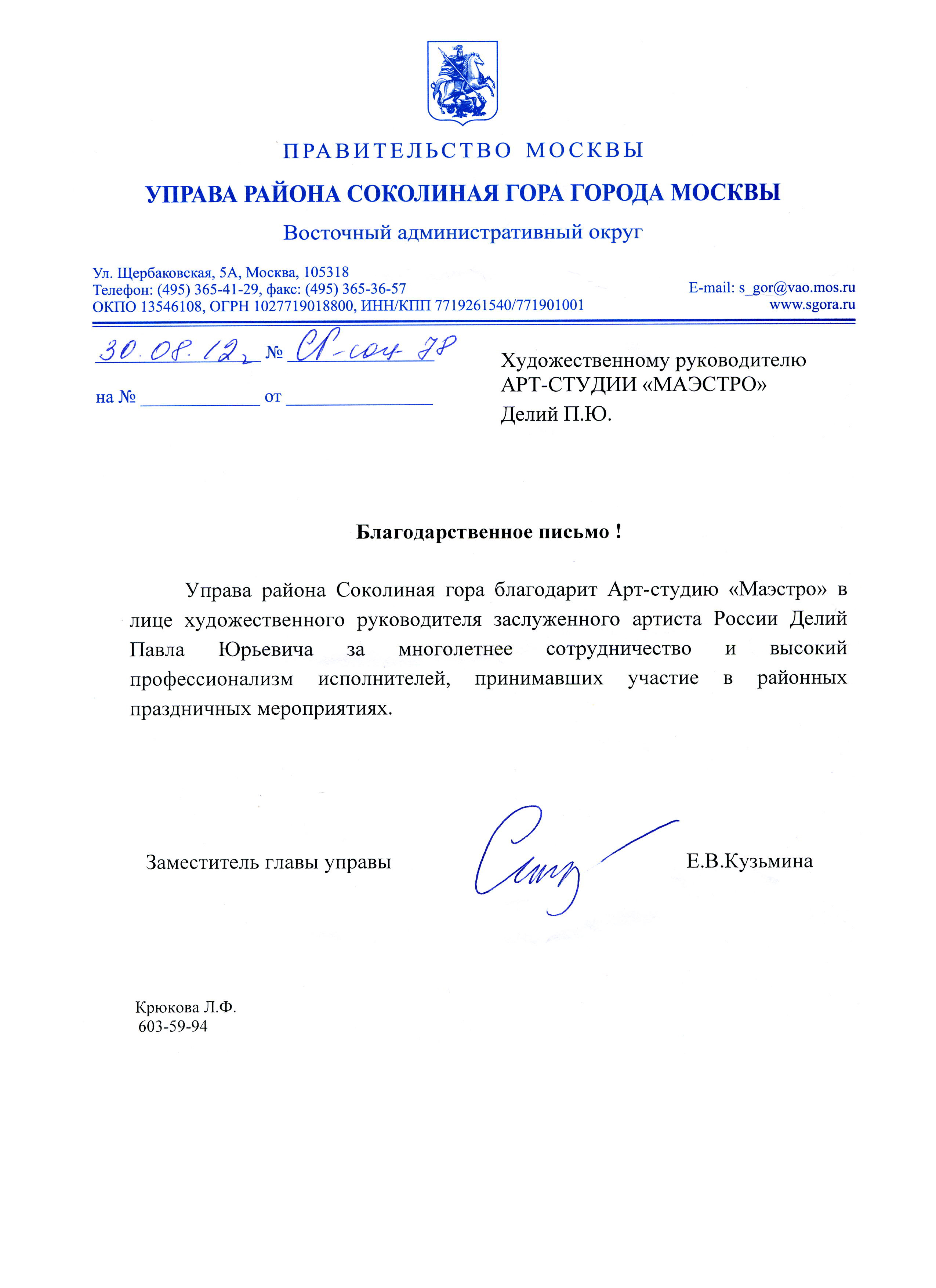 Управа района Соколиная гора благодарит Арт-студию "Маэстро" в лице художественного руководителя заслуженного артиста России Делий Павла Юрьевича за многолетнее сотрудничество и высокий профессионализм исполнителей, принимавших участие в районных праздничных мероприятиях.