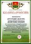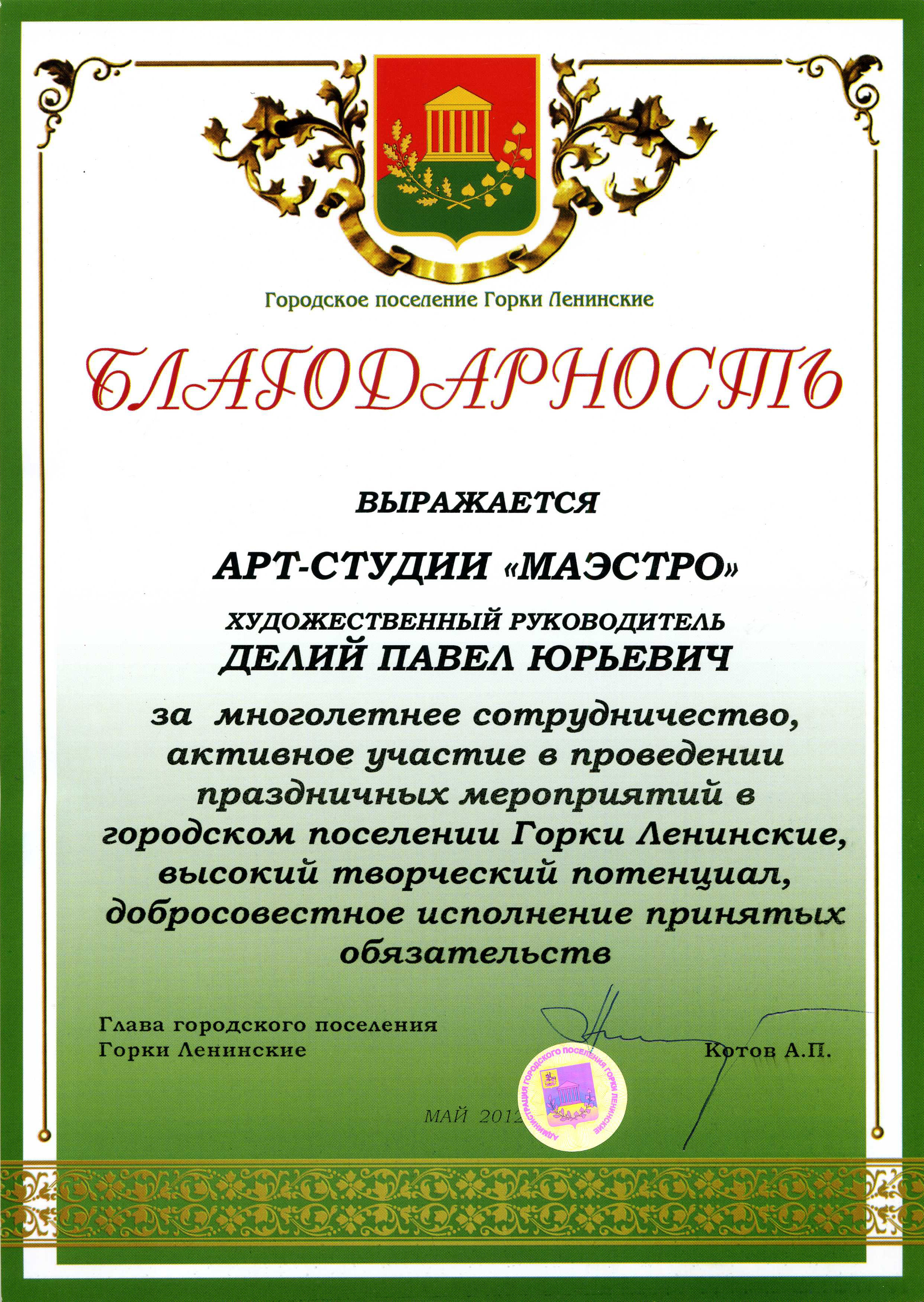 Благодарность выражается АРТ-СТУДИИ "МАЭСТРО" художественный руководитель Делий Павел Юрьевич за многолетнее сотрудничество, активное участие в проведении праздничных мероприятий в городском поселении Горки Ленинские, высокий тверческий потенциал, добросовестное исполнение принятых обязательств.