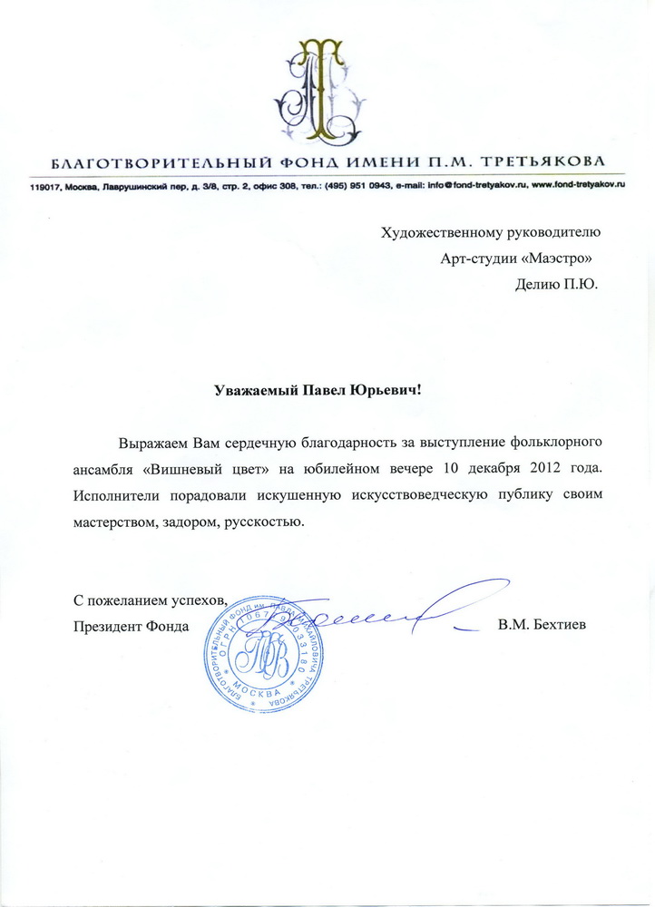 Выражаем Вам сердечную благодарность за выступление фольклорного ансамбля "Вишневый цвет" на юбилейном вечере 10 декабря 2012 года. Исполнители порадовали искушенную искусствоведческую публику своим мастерством, задором, русскостью.
