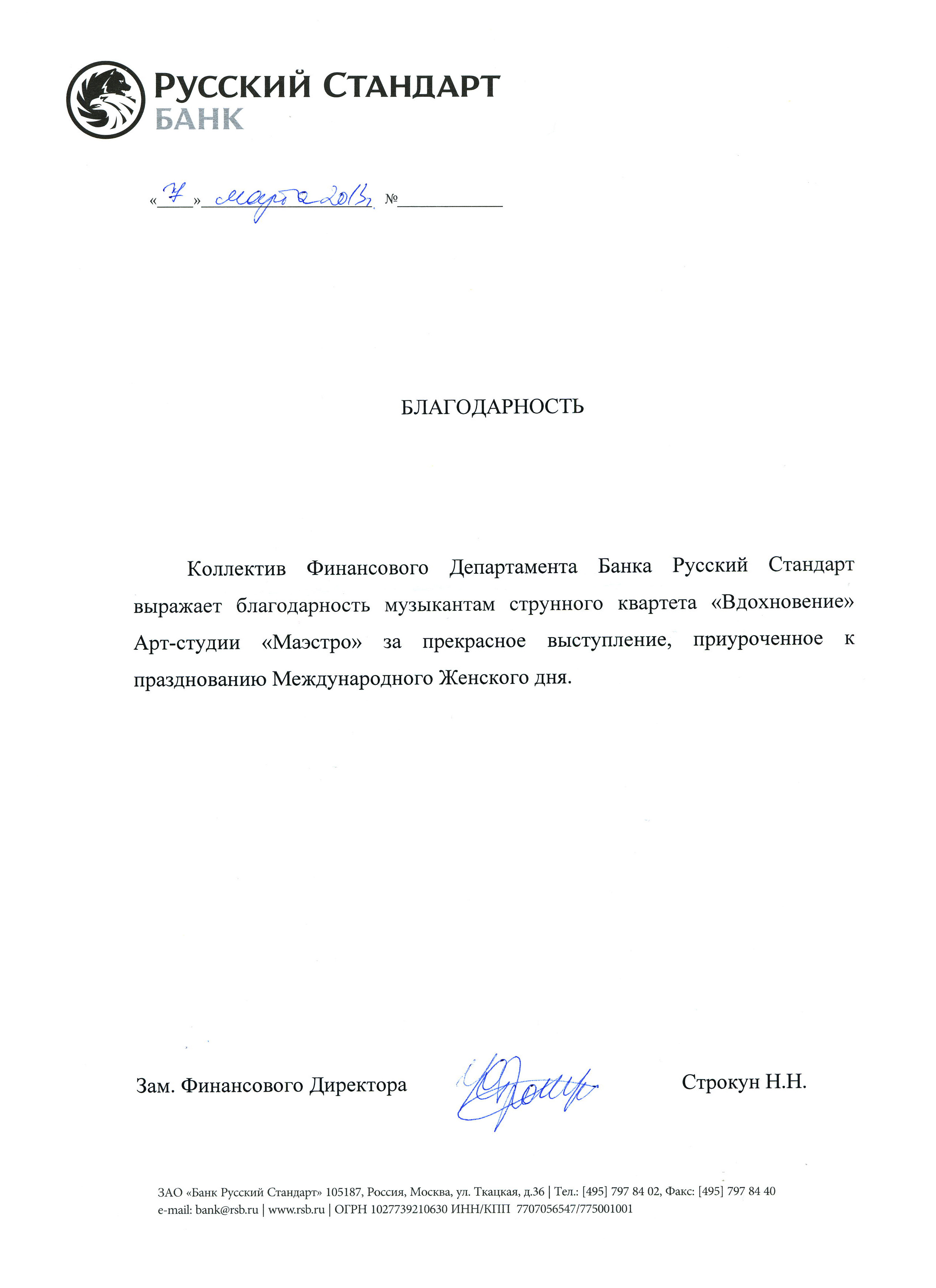Коллектив Финансового Департамента Банка "Русский Стандарт" выражает благодарность музыкантам струнного квартета "Вдохновение" Арт-студии "Маэстро" за прекрастное выступление, приуроченное к празднованию Международного Женского дня.