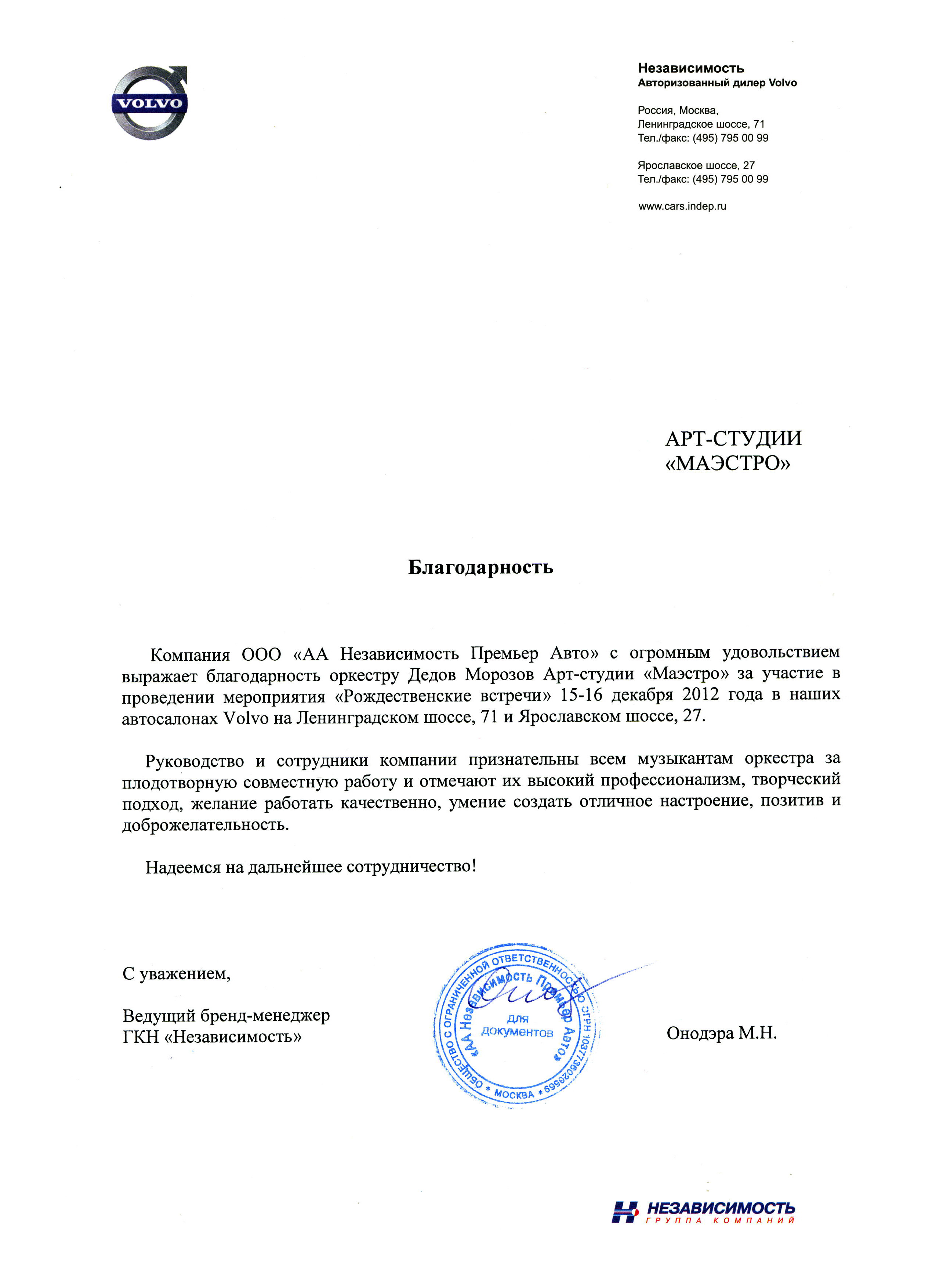 Компания ООО "АА Независимость Премьер Авто" с огромным удовольствием выражает благодарность оркестру Дедов Морозов Арт-студии "Маэстро" за участие в проведении мероприятия "Рождественские встречи" 15-16 декабря 2012 года в наших автосалонах Volvo на Ленинградском шоссе, 71 и Ярославском шоссе, 27.