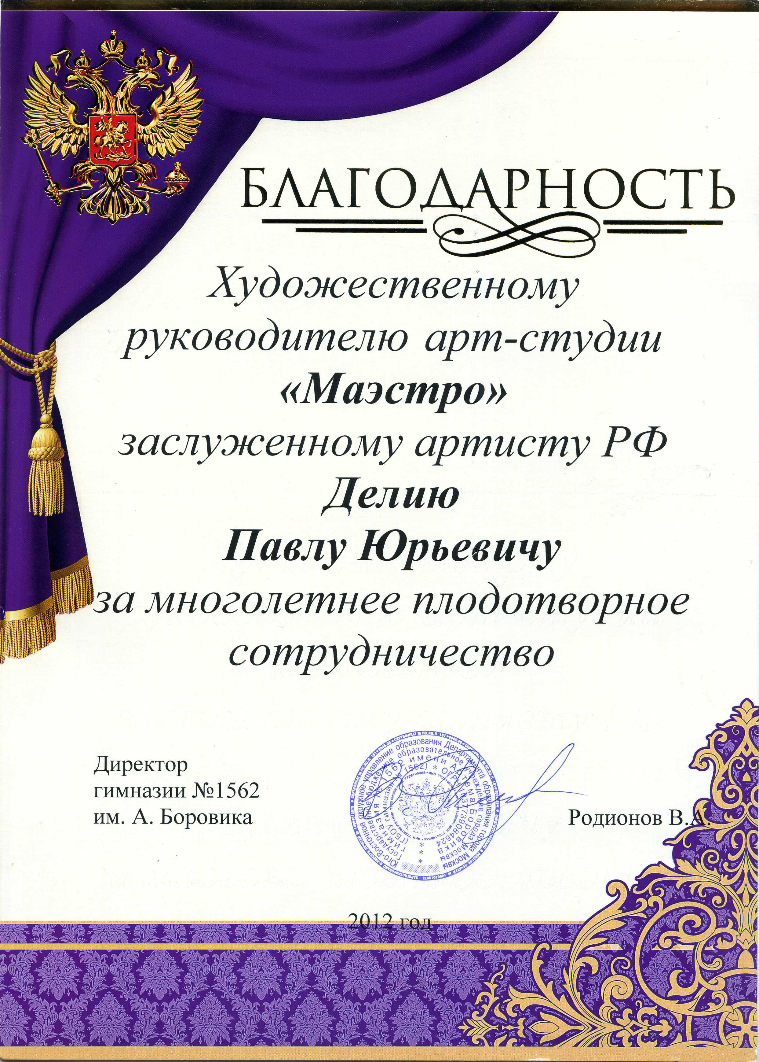 Выражаем благодарность художественному руководителю арт-студии "Маэстро", заслуженному артисту РФ Делию Павлу Юрьевичу за многолетнее плодотворное сотрудничество.