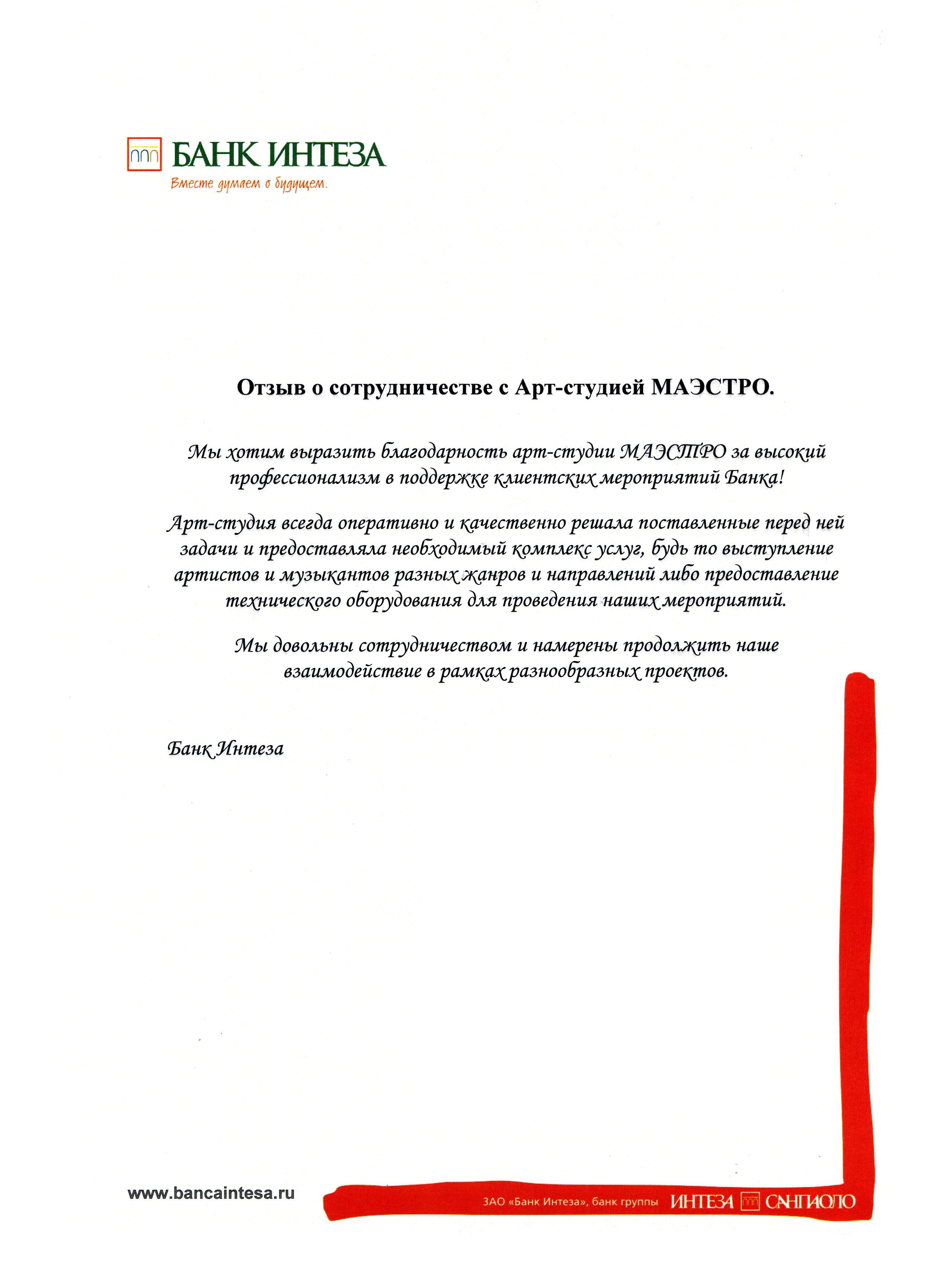 Мы хотим выразить благодарность арт-студии МАЭСТРО за высокий профессионализм в поддержке клиентских мероприятий Банка! Арт-студия всегда оперативно и качественно решала поставленные перед ней задачи и предоставляла необходимый комплекс услуг, будь то выступление артистов и музыкантов разных жанров и направлений либо предоставление технического оборудования для проведения наших мероприятий. Мы довольны сотрудничеством и намерены продолжить наше взаимодействие в рамках разнообразных проектов.